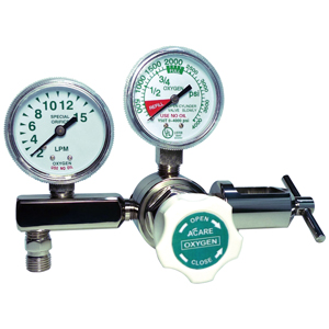 Material: Pure brass body with chrome. Output pressure rate is variant while adjusting flow. Flow Rate: 0~15 lpm Inlet Position: Side entry Various types of inlet connection can be selected. Accessories: humidifier & cannula