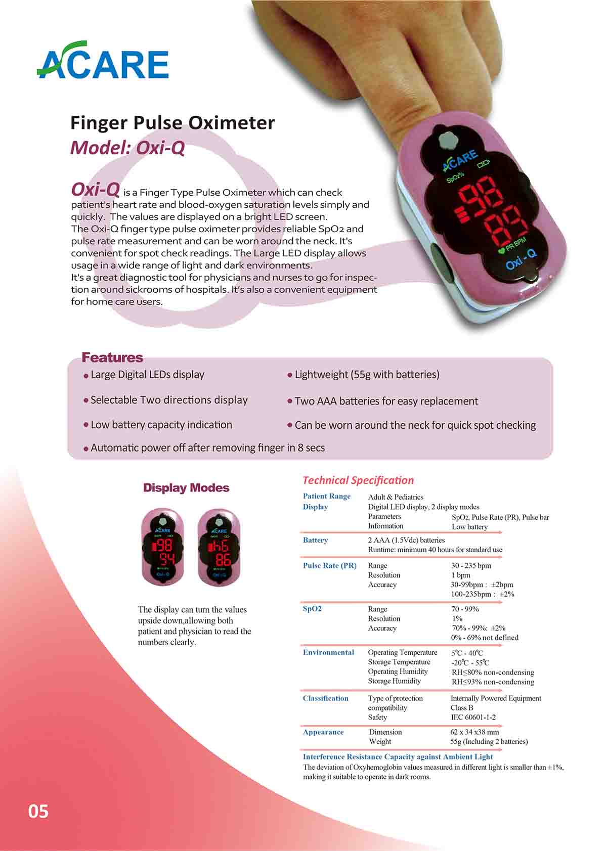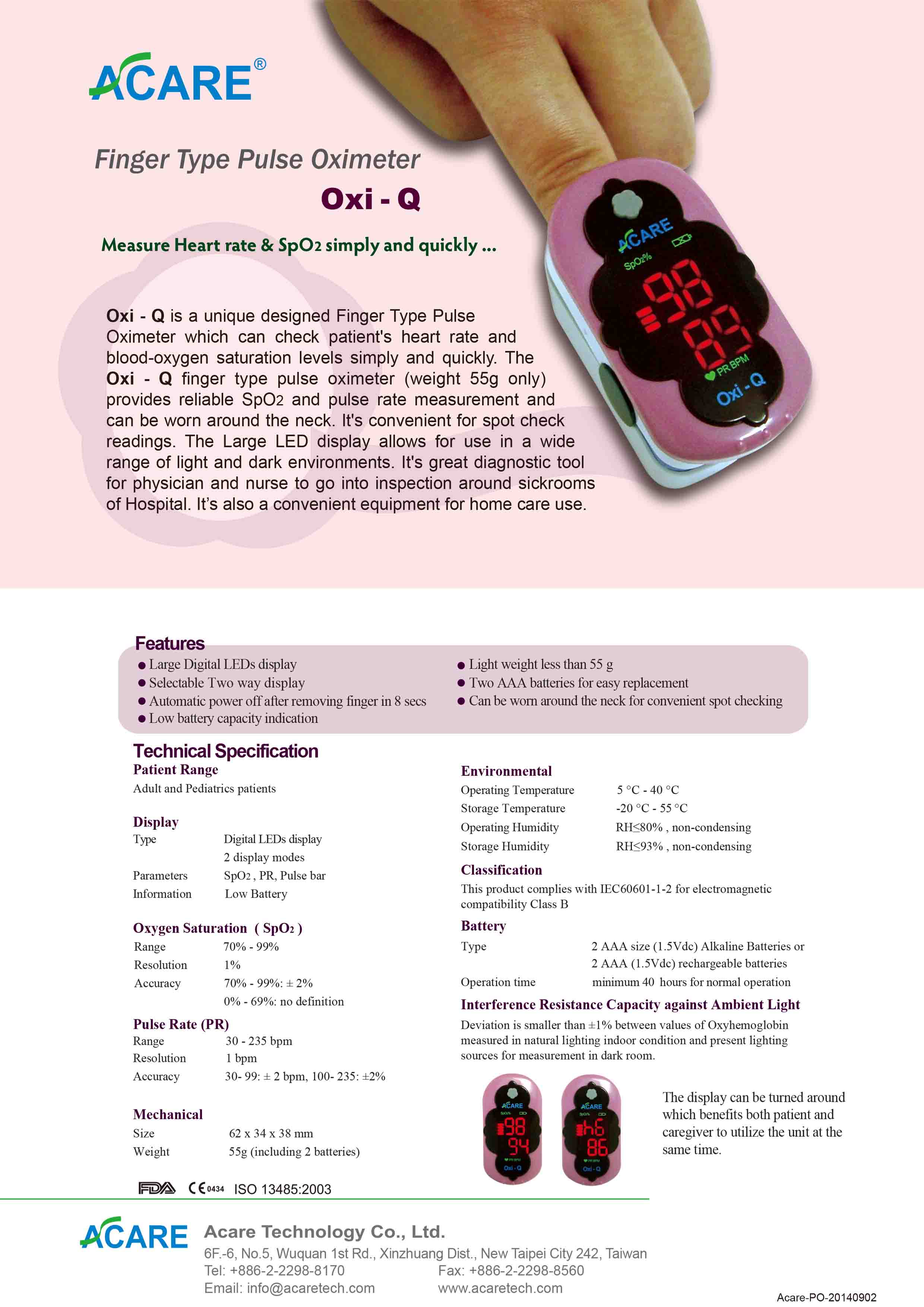 The Oxi-Q finger type pulse oximeter provides reliable SpO2 and pulse rate measurement and