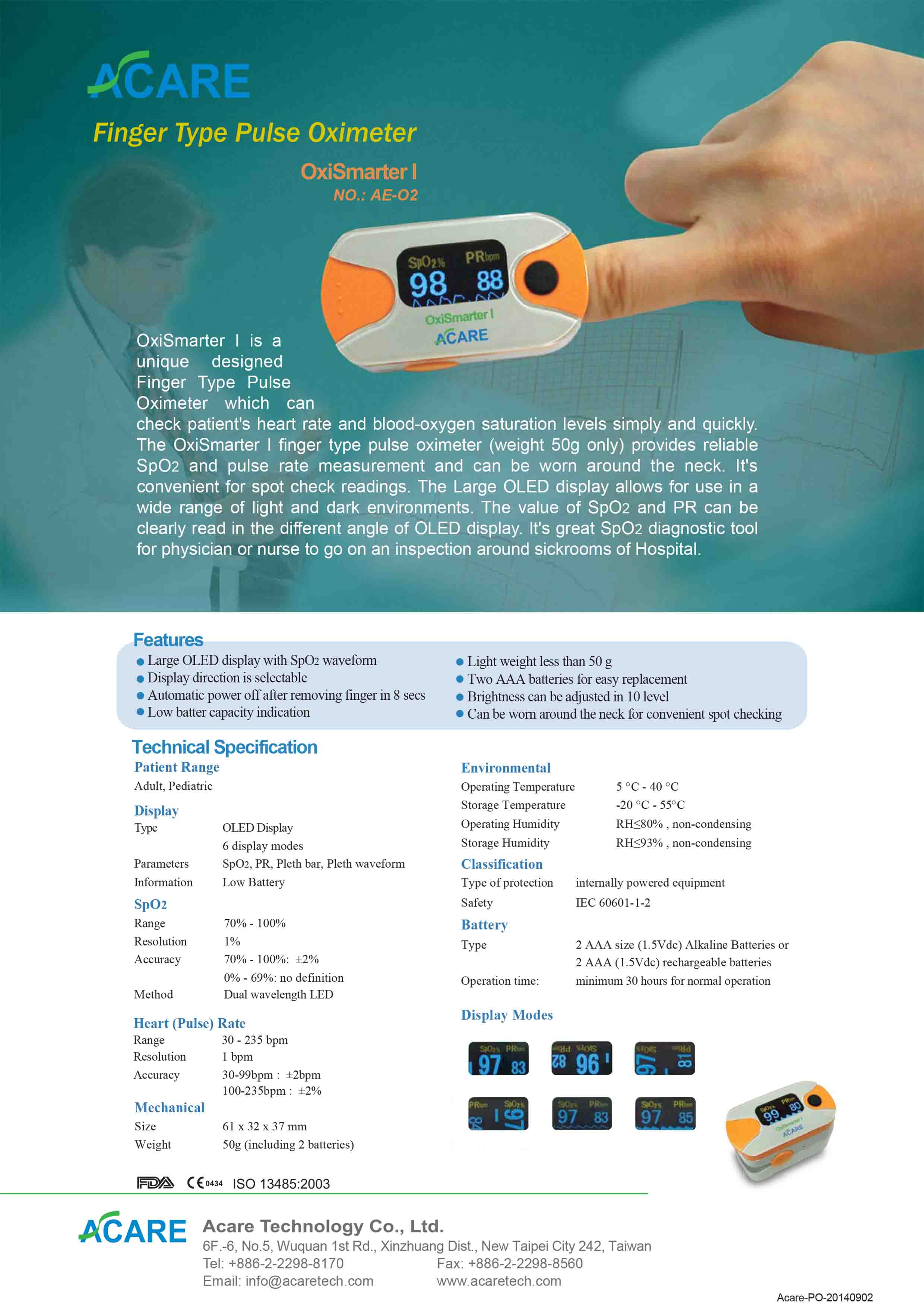 The OxiSmarter I finger type pulse oximeter provides reliable SpO2 and pulse rate